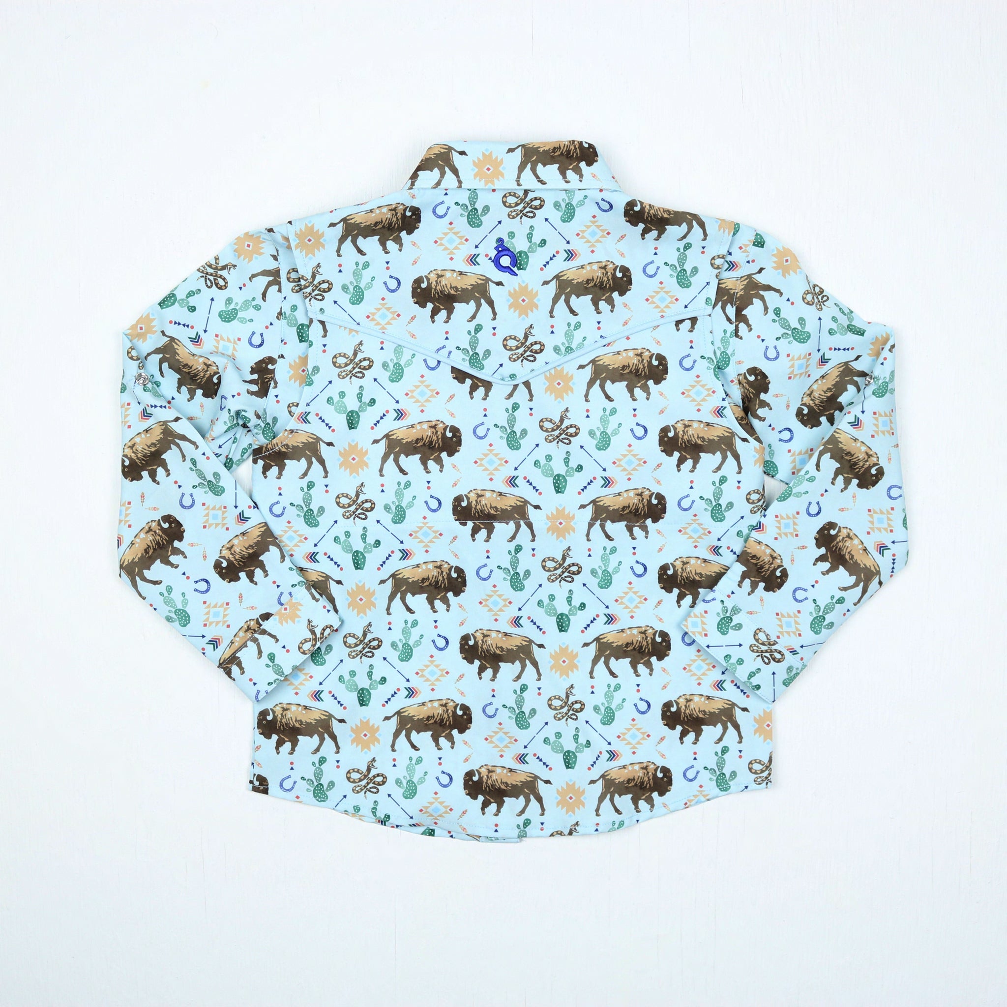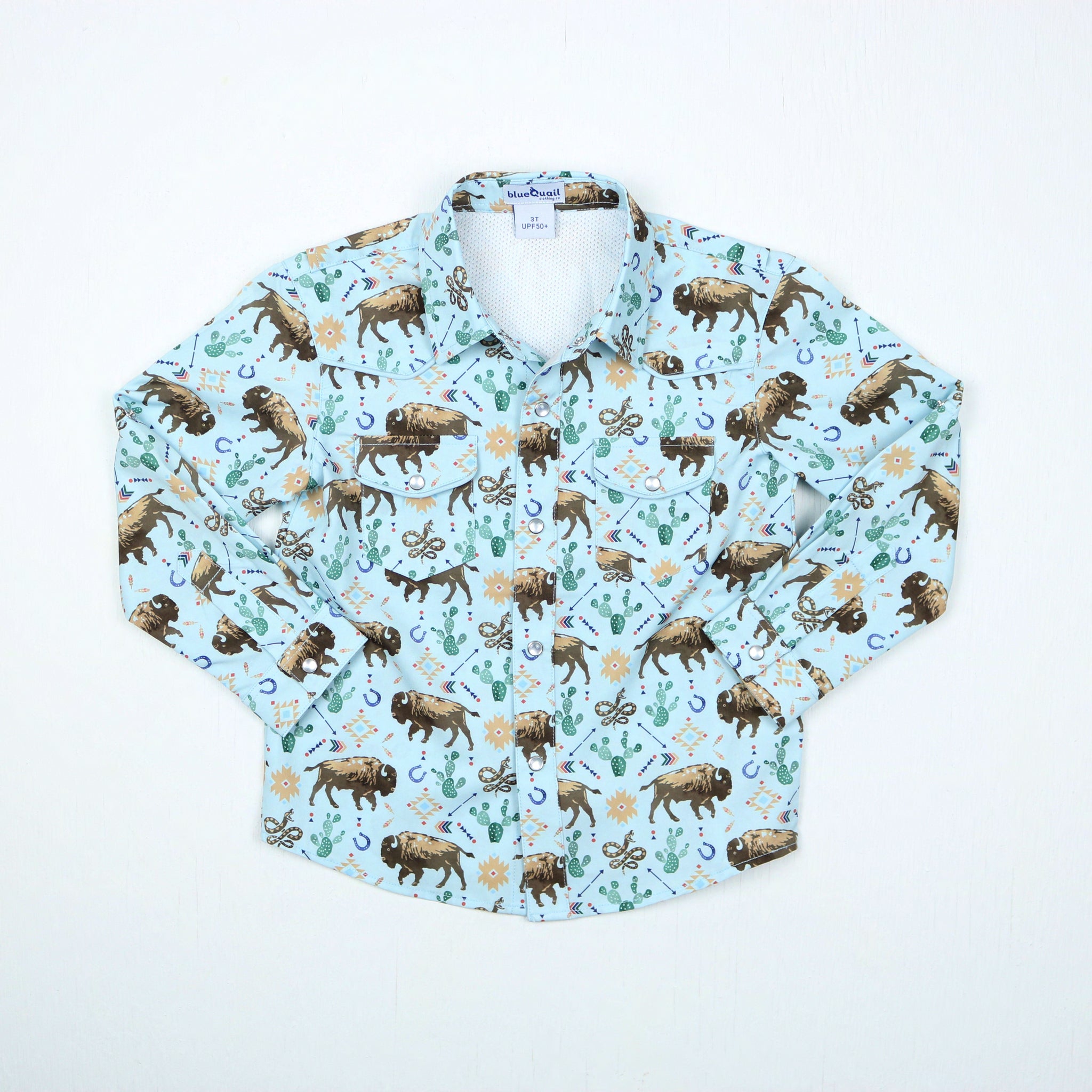 Get your little one ready for adventures in the BlueQuail Western Buffalo Pearl Snap Long Sleeve Shirt. This playful shirt features fun buffalo prints and easy-to-use pearl snap buttons, perfect for active boys who love a touch of western charm. Its long sleeves keep him comfy and covered during outdoor play, making it a great addition to any young cowboy’s wardrobe.