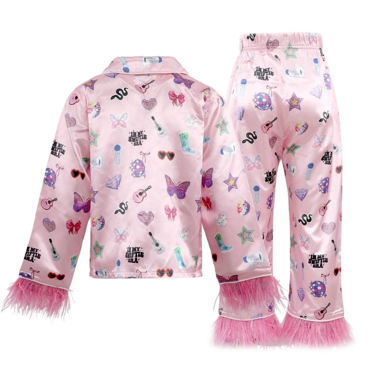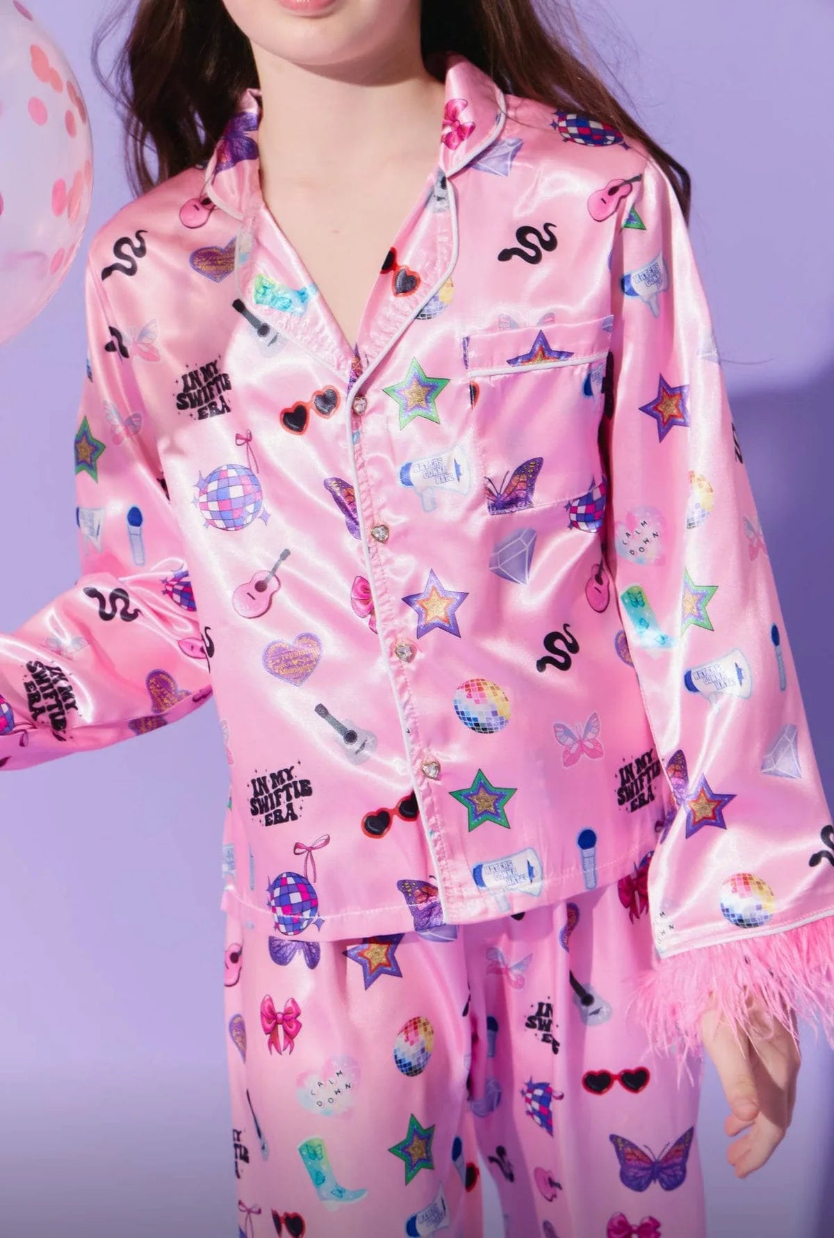 The Lola + The Boys In My Swiftie Era Silky Set is a glamorous two-piece designed just for girls who love to sparkle. Made from silky-smooth fabric, it features a lively Swiftie-inspired print filled with stars, hearts, and fun iconic motifs. Perfect for playtime or special occasions, this set brings a playful vibe while keeping comfort stylish and cool.