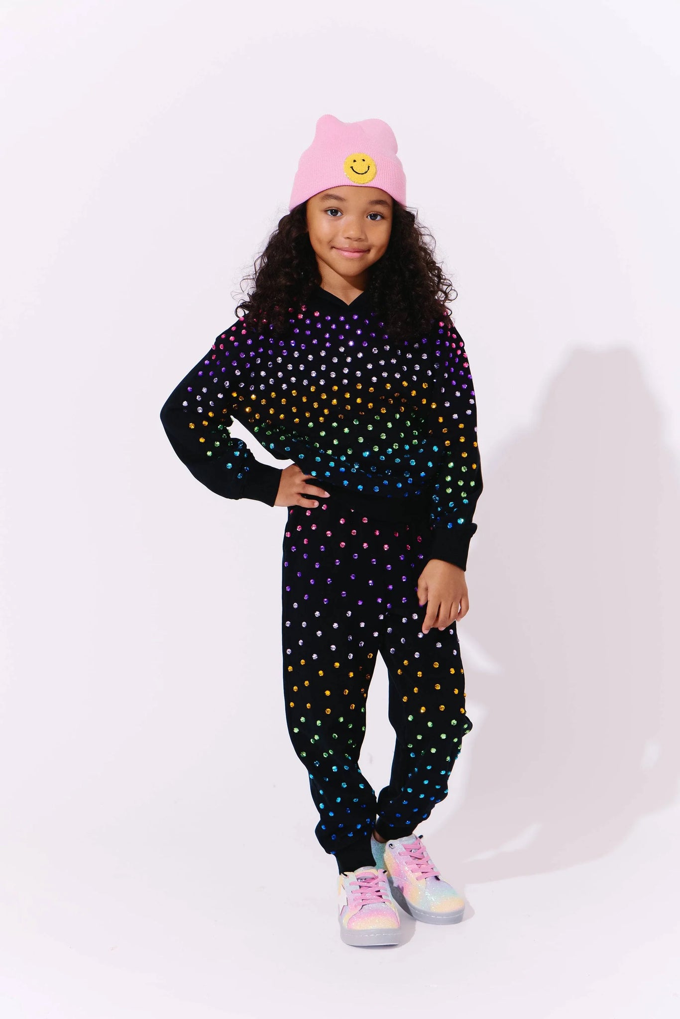 Get ready to sparkle with the Lola + The Boys Shine Bright Set! This playful black hoodie and jogger duo is sprinkled with colorful rainbow rhinestones that catch every eye. Perfect for girls who love comfy style with a dazzling twist, it’s the go-to outfit for standing out while staying cozy and cool.