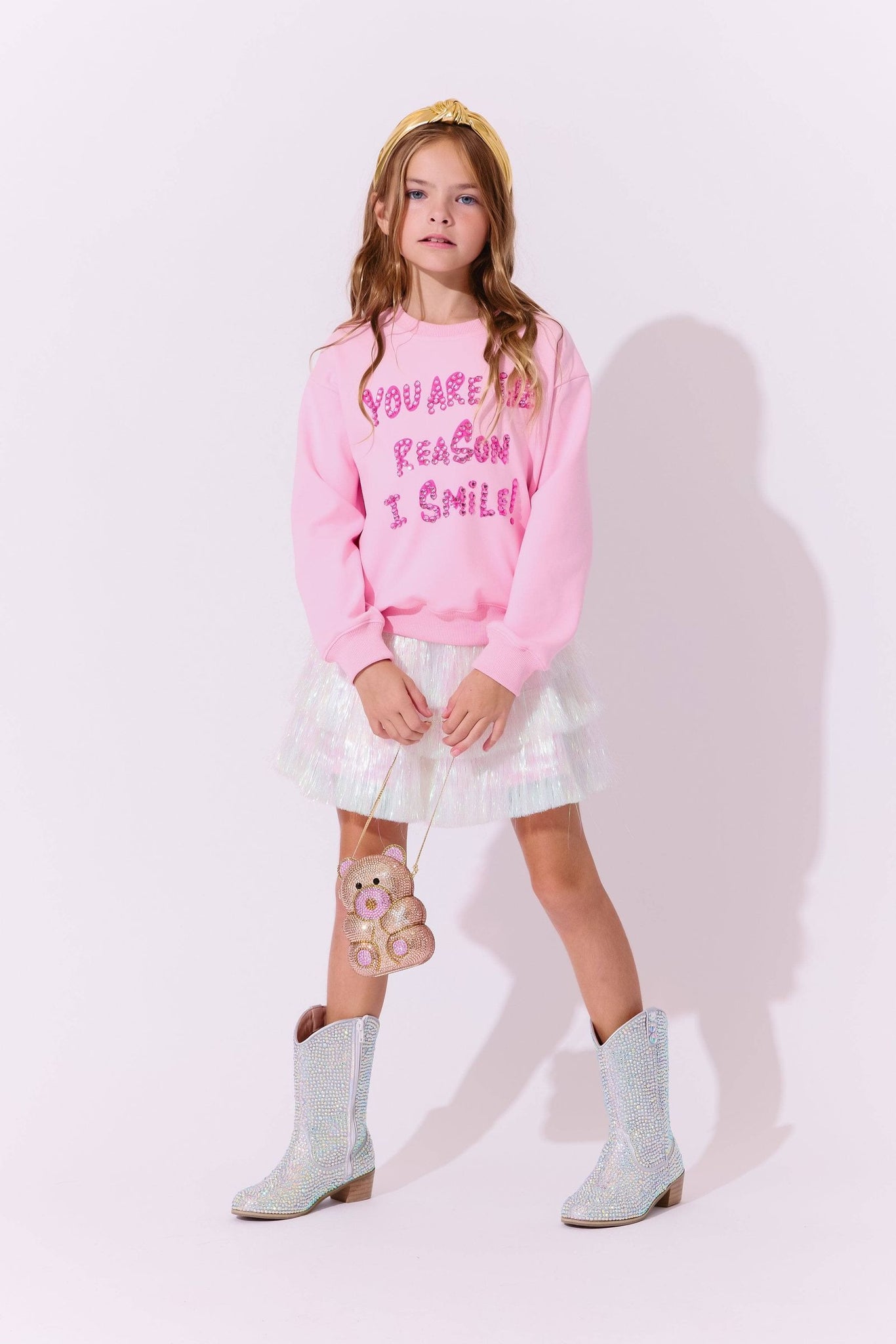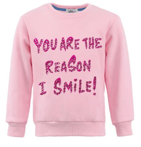 Wrap yourself in cozy comfort with this soft pink sweatshirt featuring a playful, sparkling message: "You Are The Reason I Smile." Its vibrant lettering adds a cheerful touch to your casual look, making it perfect for brightening your day and spreading good vibes wherever you go.