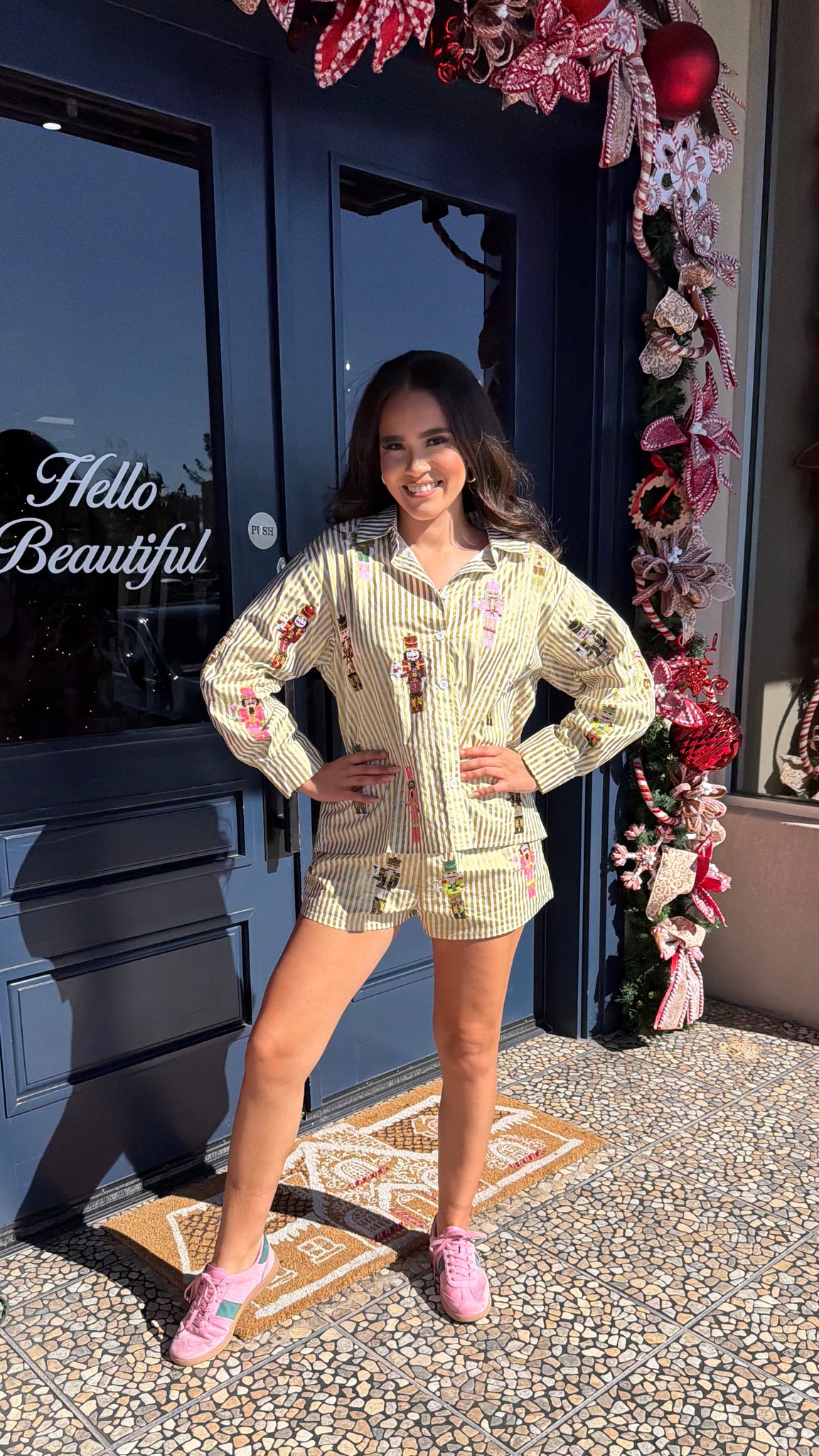 Deck the halls in dazzling style with this festive two-piece set featuring a shimmering gold metallic striped button-up paired with coordinating shorts. Perfect for holiday parties, family gatherings, or spreading Christmas cheer.